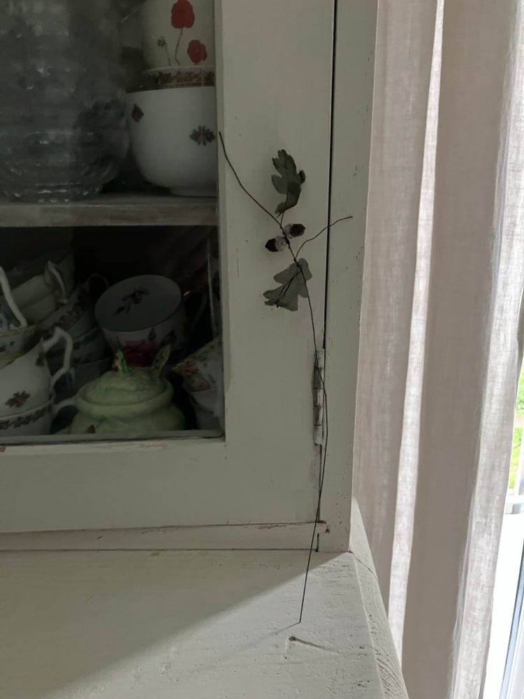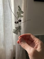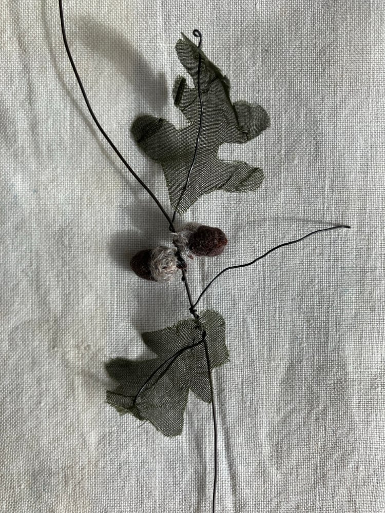 Both acorns have been made using upcycled fabric and wool. Tiny hand stitches hold the acorn together, and is attached to a wire ‘twig’, adorned with upcycled fabric leaves.